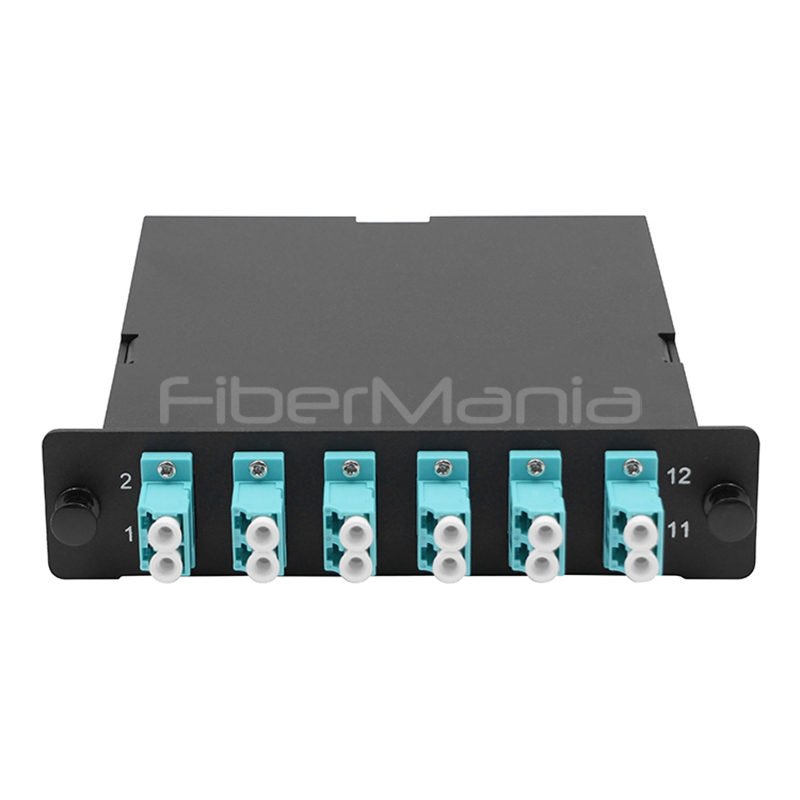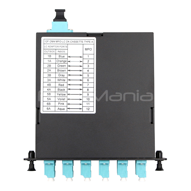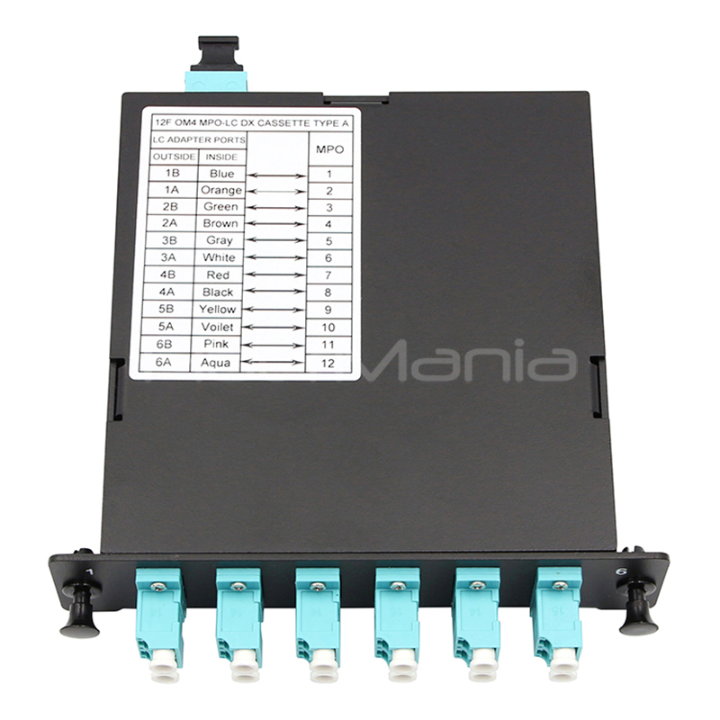 Casete MPO/MTP capaz de aceptar de 6 a 24 fibras. Estos casetes son adecuados para su uso con aplicaciones monomodo, multimodo 62.5 y 50um, así como optimizadas para láser, OM3 y están disponibles en tipos de conectores LC, SC, ST, FC, MTRJ. El casete MPO/MTP viene preinstalado con los adaptadores requeridos con manguitos de cerámica de circonio para una compatibilidad mejorada con todas las aplicaciones. Los adaptadores están codificados por colores según la aplicación en uso (Azul = 9/125; Beige = 62.5 y 50um; Aqua = OM3; Verde = APC). Todos los adaptadores vienen de serie con cubiertas antipolvo.